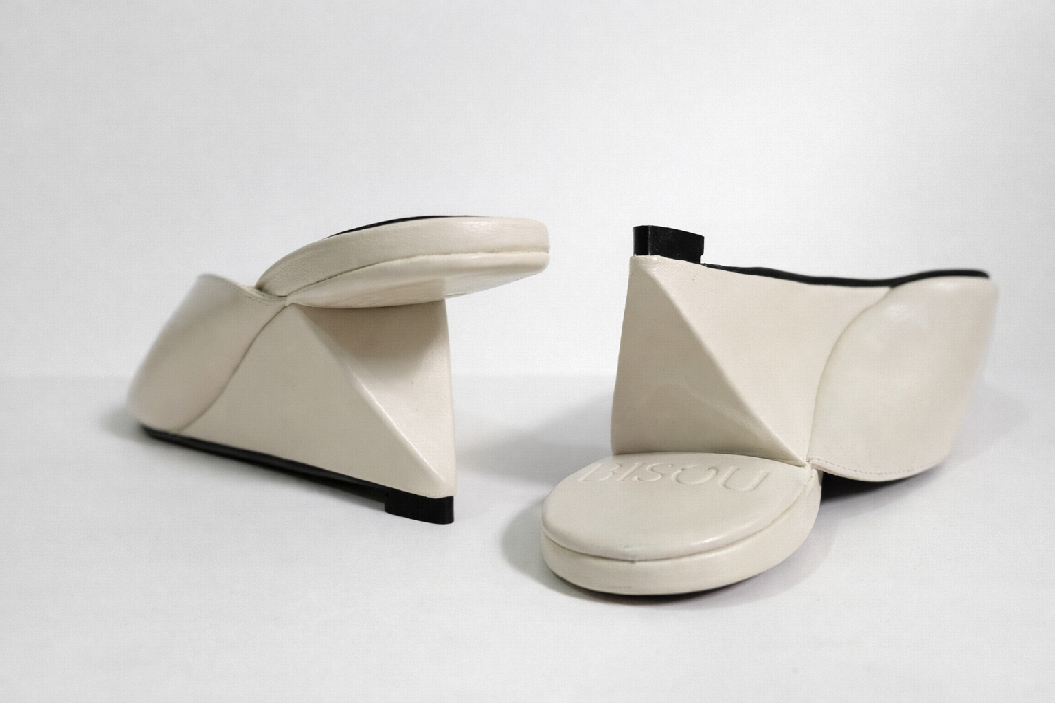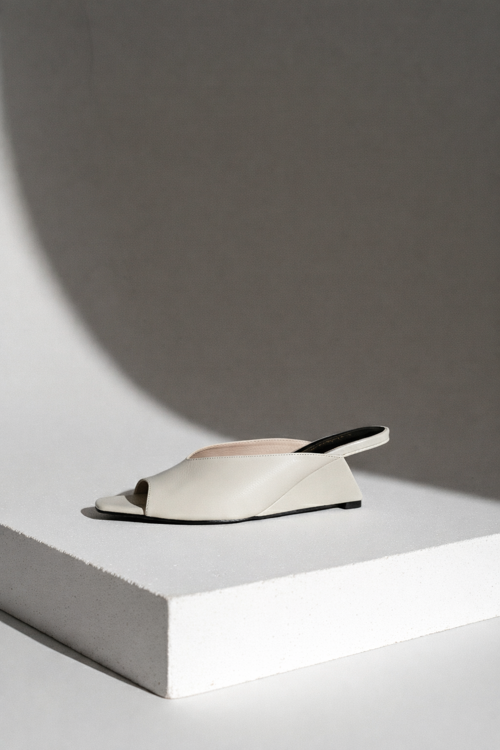 El tacón geométrico inclinado distribuye el peso hacia el centro, generando estabilidad real. No es un simple recurso visual: es una decisión estructural. Capellada con apertura frontal libera los dedos y aligera la silueta.