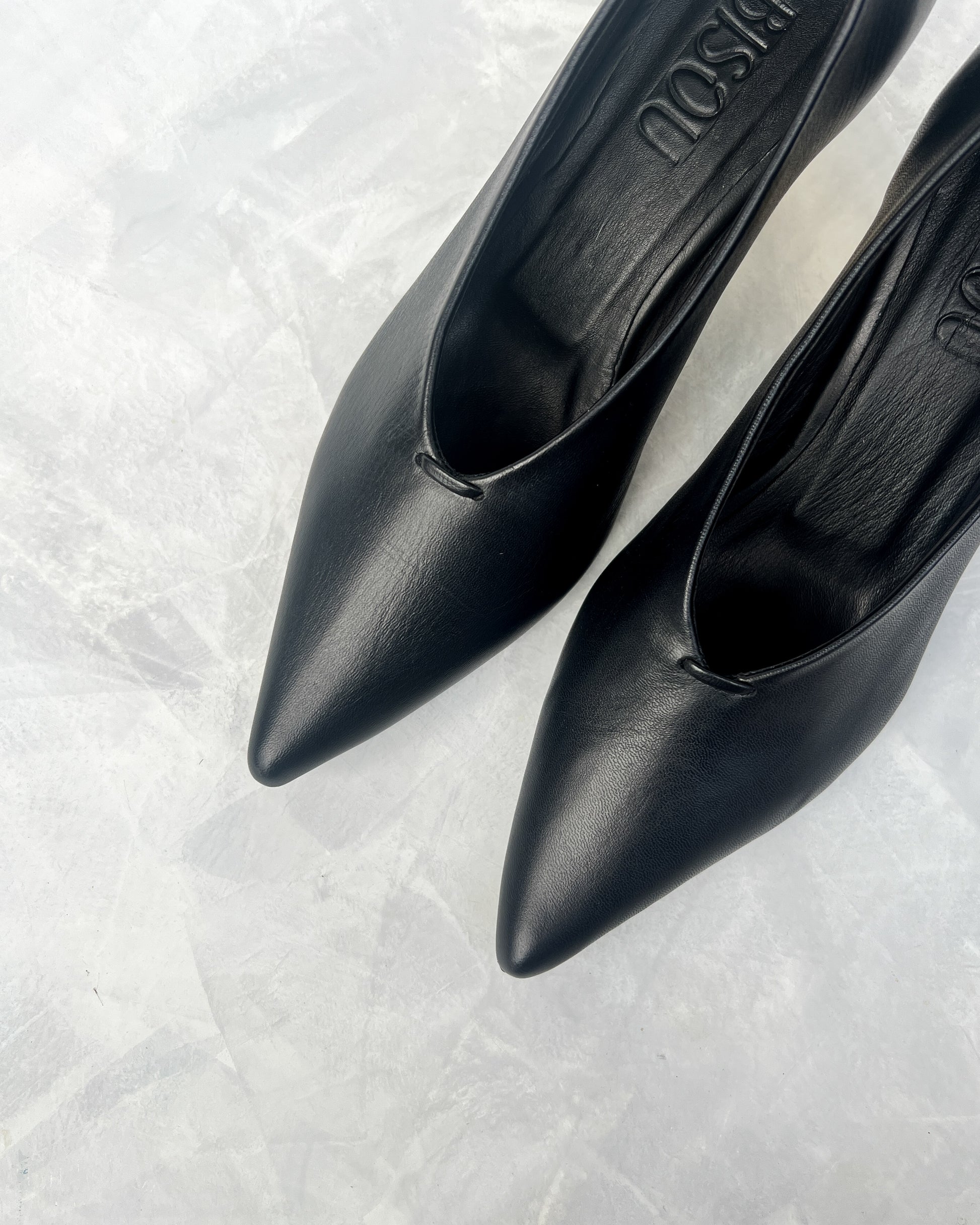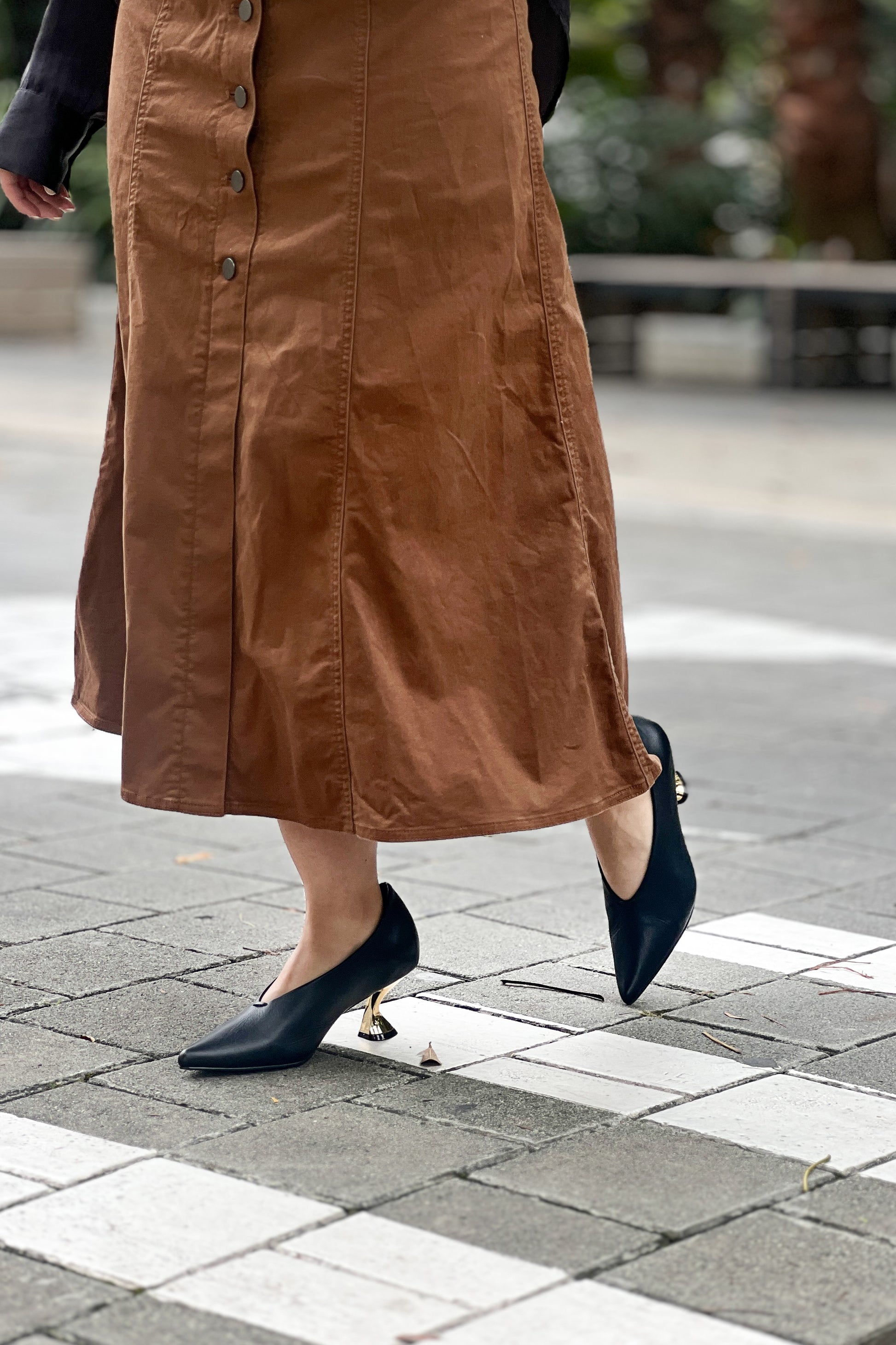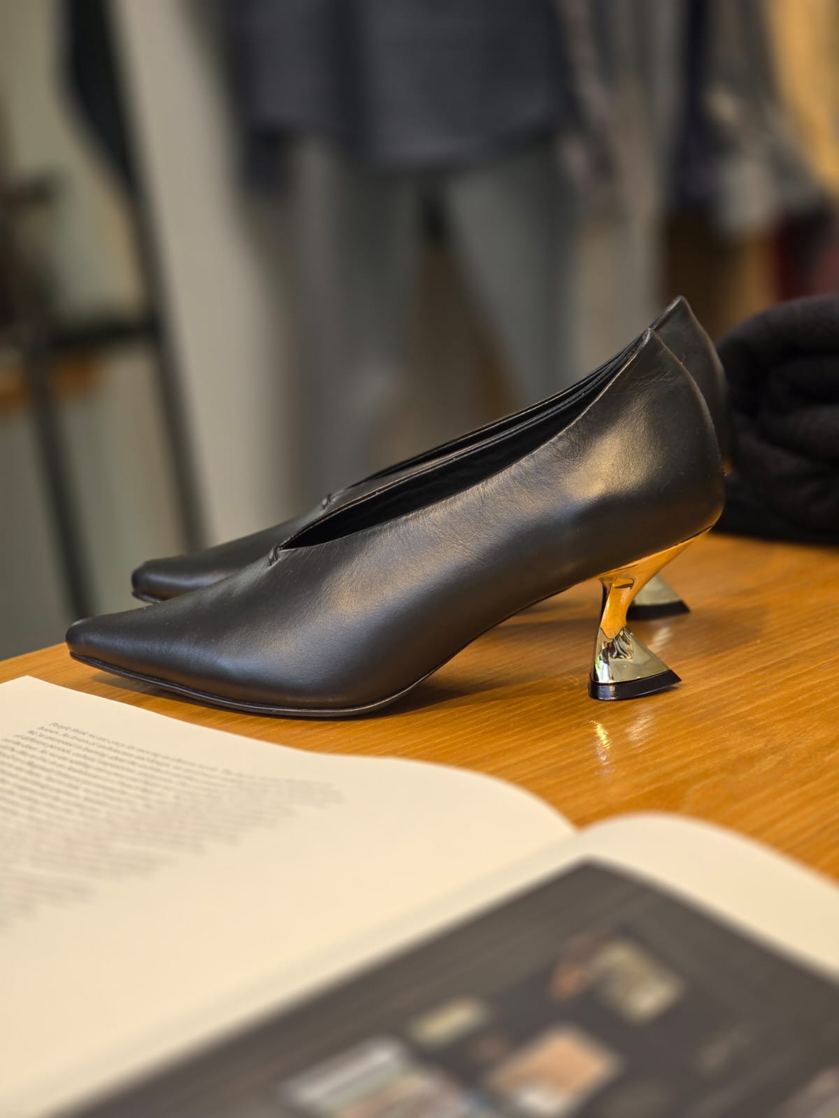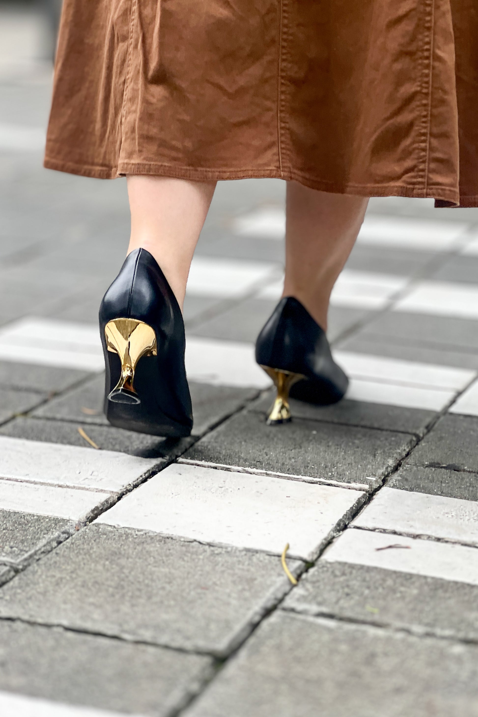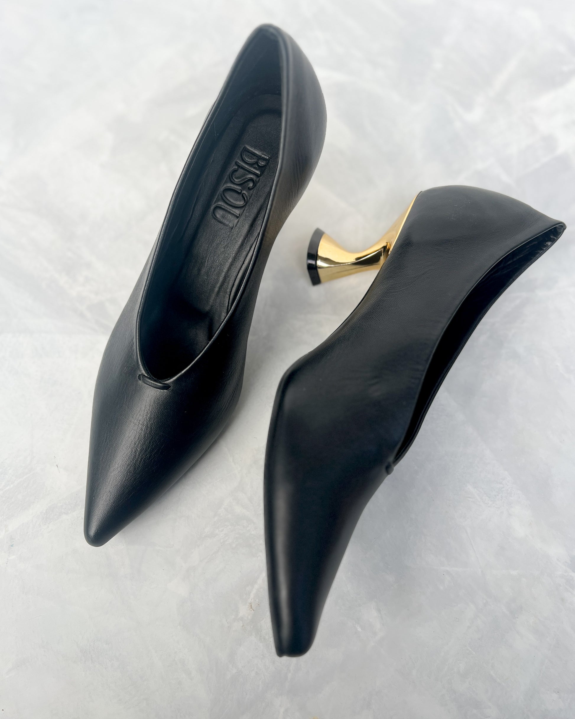 El tacón de 5,5 cm en acabado oro espejo introduce contraste y estabilidad. Su geometría garantiza apoyo real y balance correcto en la pisada.